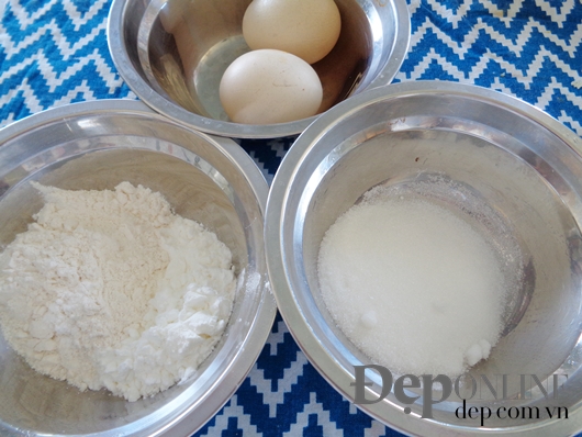 cho vào âu nhỏ. Dùng máy đánh 10 -12 phút cho lòng đỏ và đường tan và