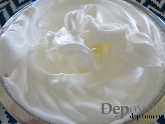 - Cho lòng trắng và nước cốt chanh cho vào âu. Dùng máy đánh 2 phút. Sau