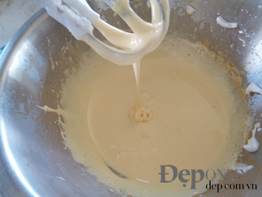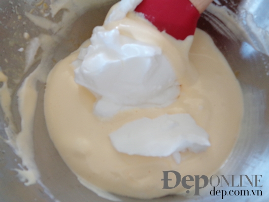phới trộn đều, sau đó cho tiếp 1/3 lòng trắng vào tiếp tục trộn. Cứ thế